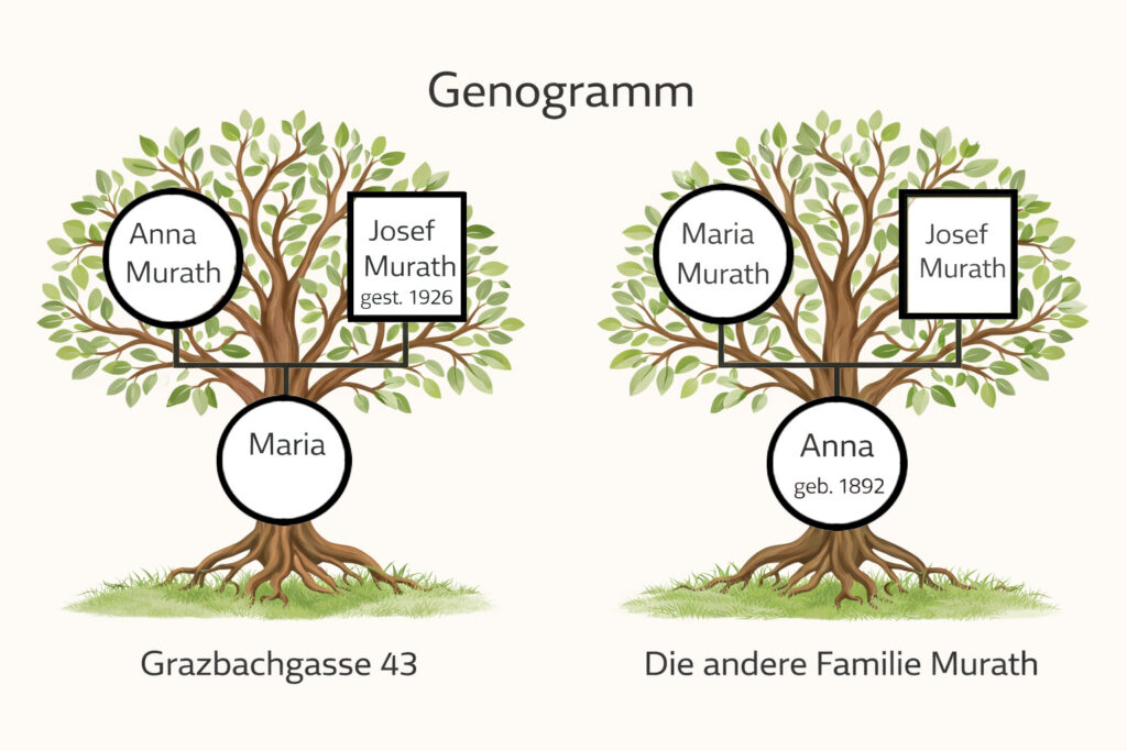 Es scheint daher, dass es sich dabei nicht um den Josef Murath aus der Grazbachgasse 45 handelt. Zwar tragen die Frauen in seinem Haushalt dieselben Namen, sie nehmen jedoch andere Rollen ein: Anna ist seine Ehefrau, Maria seine Tochter – und nicht umgekehrt.