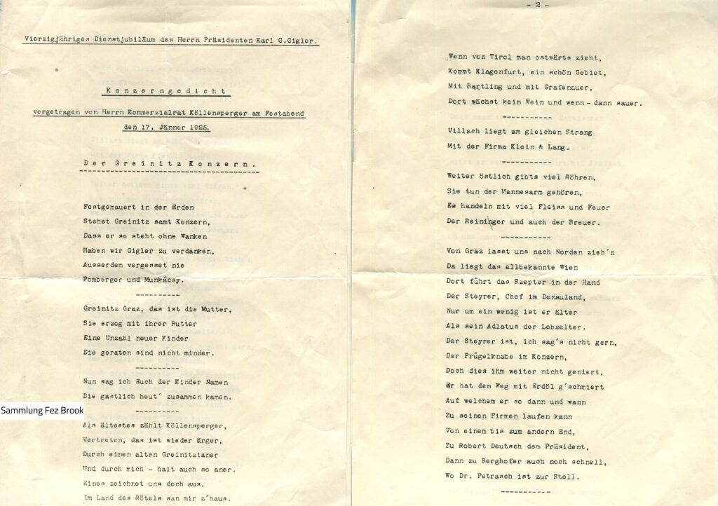 Bei dieser Feier wurde auch ein „Konzerngedicht“ von Kommerzialrat Anton Köllensperger vorgetragen, das – zusammen mit der Sitzordnung – die vergangenen 100 Jahre überdauert und durch einen Kauf auf Willhaben in mein Eigentum überging.