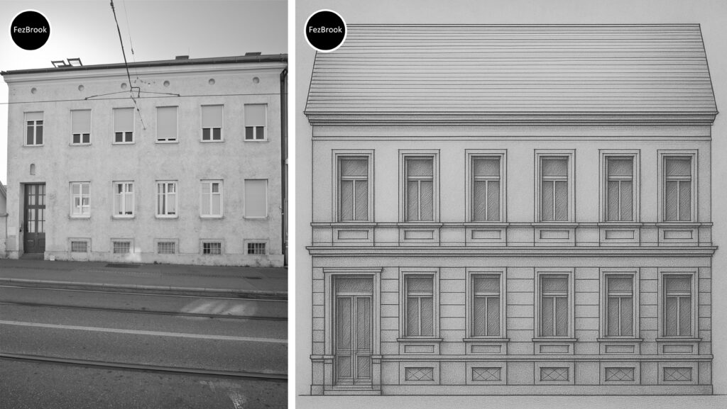 Links: Moserhofgasse 59, mit einer begradigten Fassade, Foto Fez Brook, 2025; rechts: eine mit chatgpt erstellte Hausskizze, die sich am Originalplan orientiert.