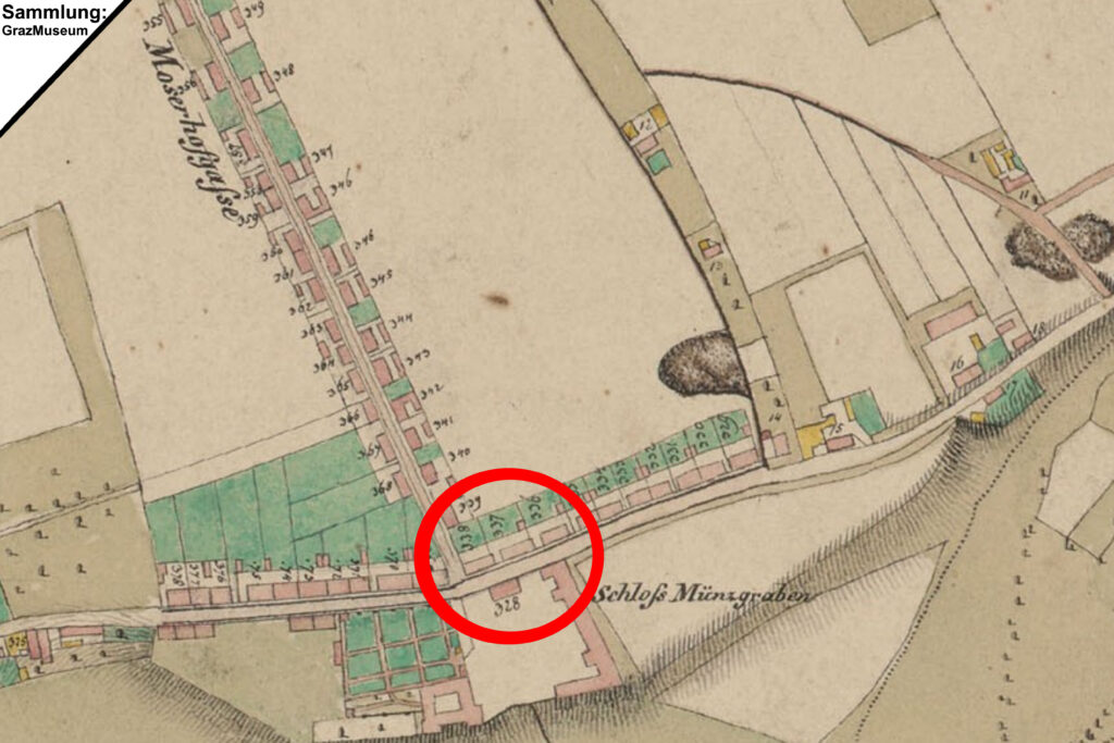Auf dem Stadtplan von Graz aus dem Jahr 1840 (Sammlung GrazMuseum) ist zwischen den Häusern mit den Nummern 338 und 337 eine Baulücke zu sehen. Das bedeutet, dass an dieser Stelle damals noch kein Gebäude stand. Im Situationsplan eines dazugehörigen Bauakts wird das Haus 337 allerdings mit der Hausnummer 237 bezeichnet. Auch so in der zitierten Stelle aus dem Akt (vgl. Zitat oben).