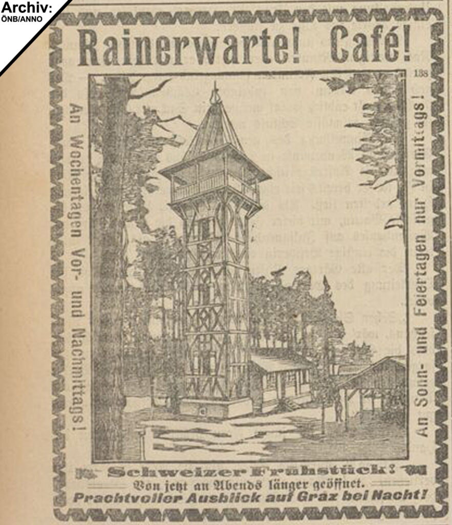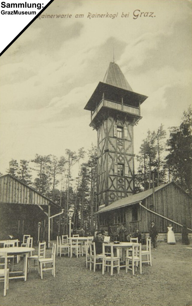 „Der schlanke Bau der Warte erhebt sich aus dem grünenden Walde als ein neues Wahrzeichen in der Umgebung von Graz. Der aus lichtem Holze ausgeführte Bau, zu welchem der Baumeister Josef Laber die Grundfeste mit großen Kellereien gelegt hat, ist ein Werk des Zimmermeisters Herrn Josef Fekonja, das gewiss seinen Meister lobt und volle Anerkennung findet. Die Höhe der Warte beträgt bis zur Plattform 16 Meter, die Gesammthöhe bis zum Firste des Daches 25 Meter. Wollen wir noch Zahlen hinzufügen, die vielleicht den Leser interessieren, so sei erwähnt, dass die absolute Höhe der Warte 517 Meter, also ungefähr um 49 Meter mehr als jene des Schlossberges, beträgt. Bis zur Plattform führen 75 Stufen. Um unterem Raume befindet sich eine Bauernstube, die „Waldschenke“, die musterhaft ausgestattet ist. Um die Warte herum sind eine Veranda und zahlreiche Ruheplätze angelegt und mit Tischen und Bänken versehen; hier wird es im Waldesschatten an heißen Sommertagen herrlich sein, zumal es auch an der nötigen Labung an Speise und Trank nicht fehlen wird, da der als tüchtige Wirtin bekannten Frau Zwickl die Wirtschaft in der Waldschenke übergeben wurde.“ („Grazer Volksblatt“, Abendausgabe, 14.05.1902)